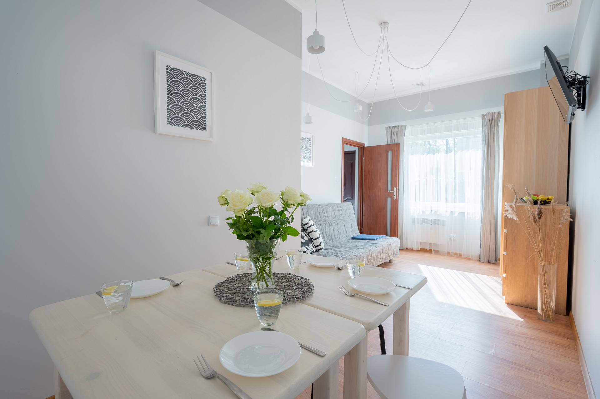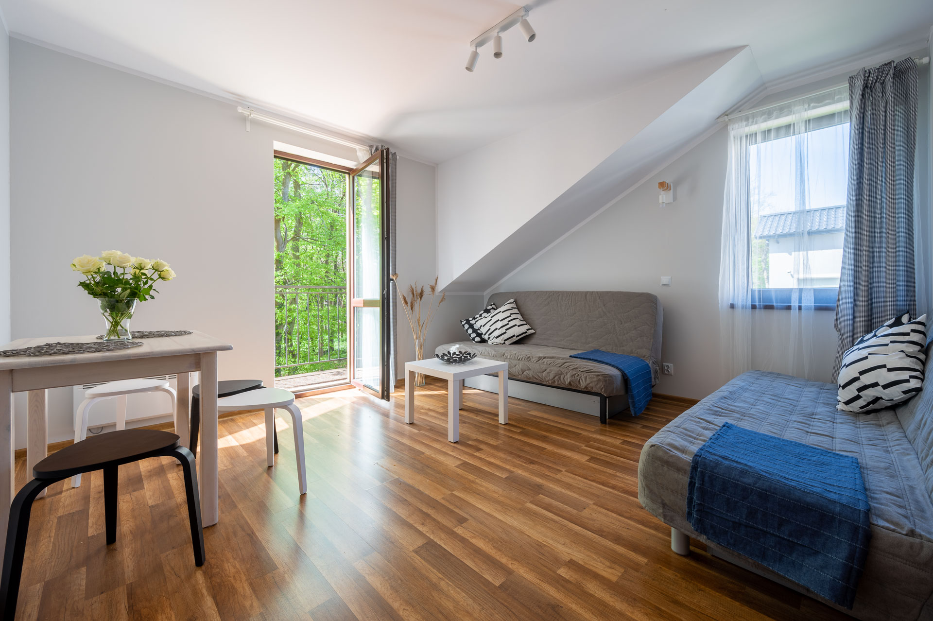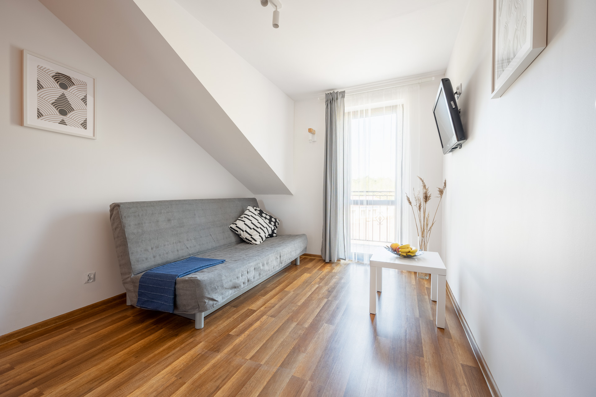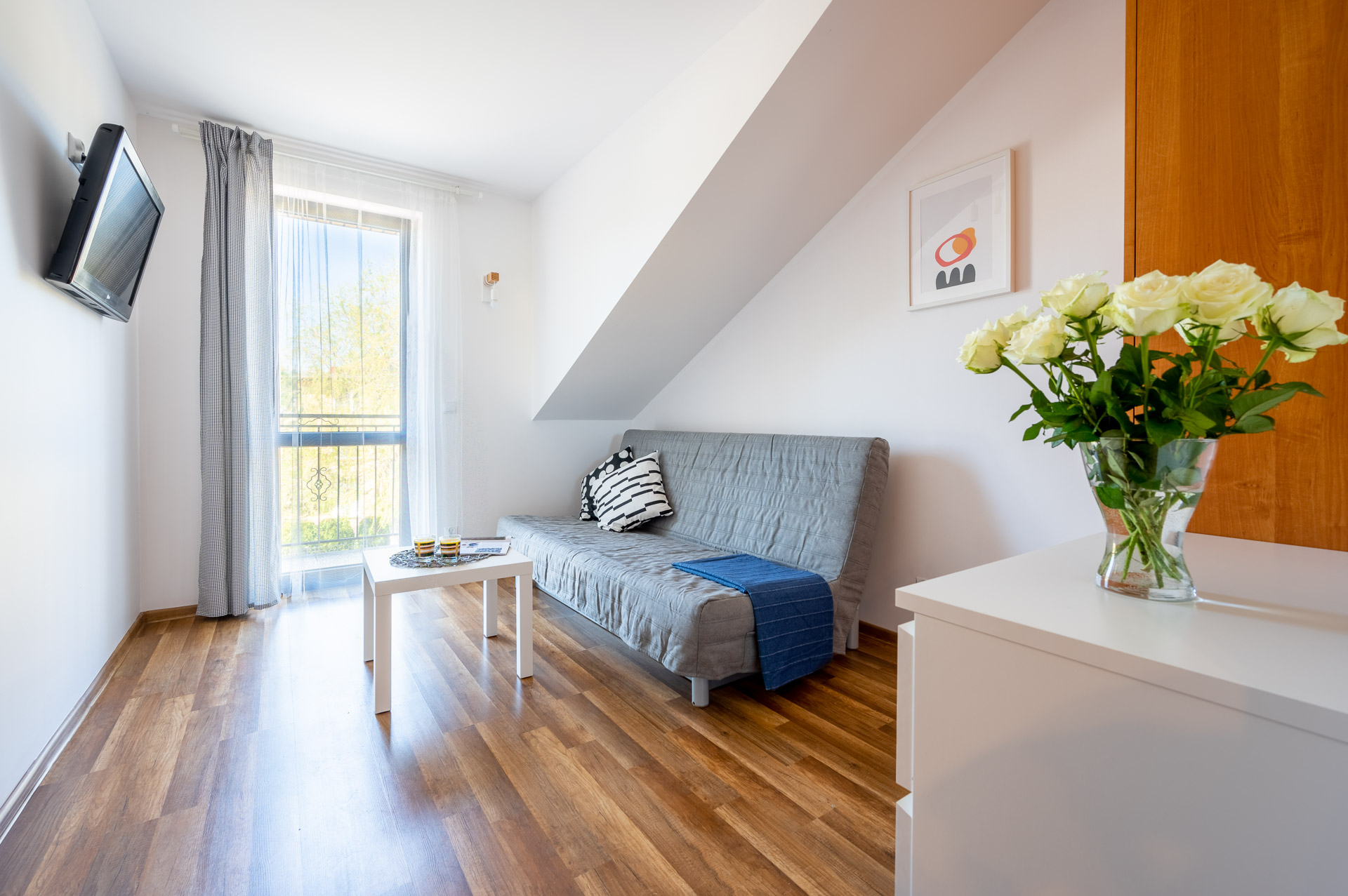 Jednopokojowy apartament z balkonem przeznaczony dla maksymalnie 4 osób (2 sofy rozkładane). W pokoju: